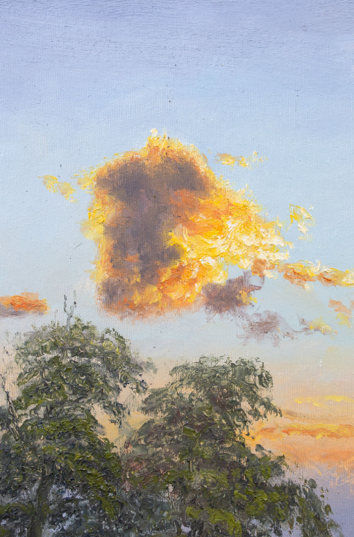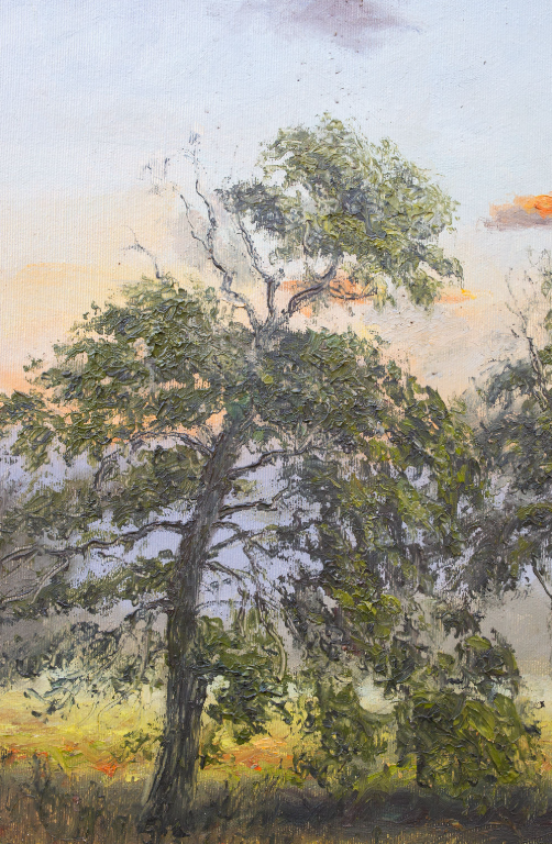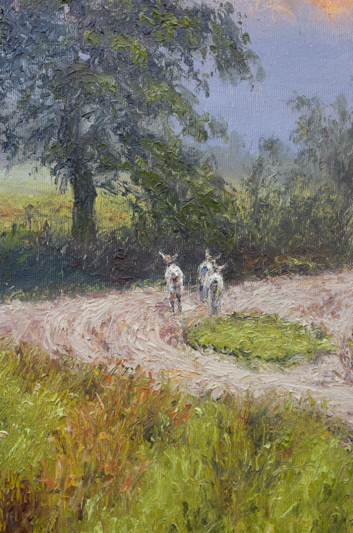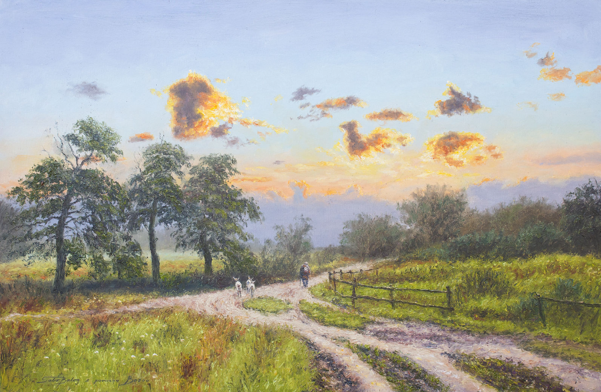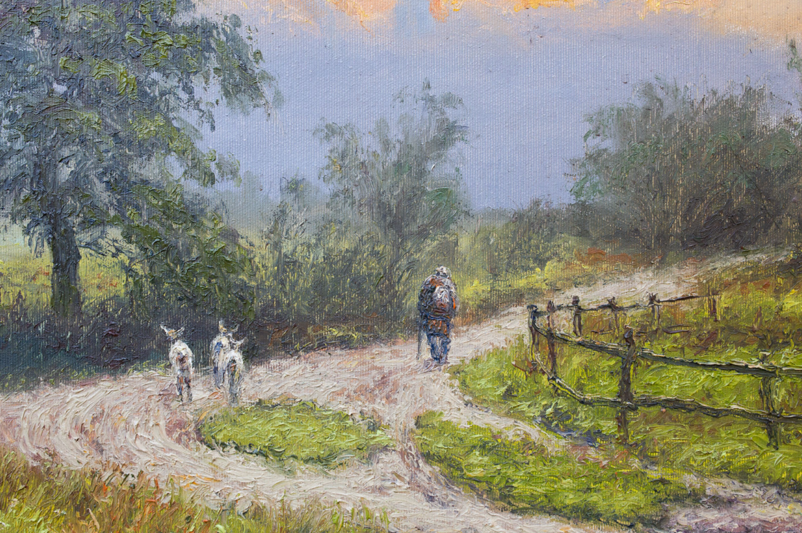 Atmosférická krajinomaľba zachytáva pokojnú vidiecku scenériu v teplom svetle zapadajúceho slnka. Maliar s jemným citom pre detail vykresľuje prašnú cestu, ktorá vedie medzi sviežimi, slnkom zaliatymi lúkami. V popredí dominuje nerovná, dažďom rozjazdená chodníková stopa a stáča sa medzi plot a skupinu šumiacich stromov. Po ceste kráča osamelá postava a sprevádzajú ju traja psi; ich siluety dodávajú obrazu ľudský rozmer a pocit návratu domov.