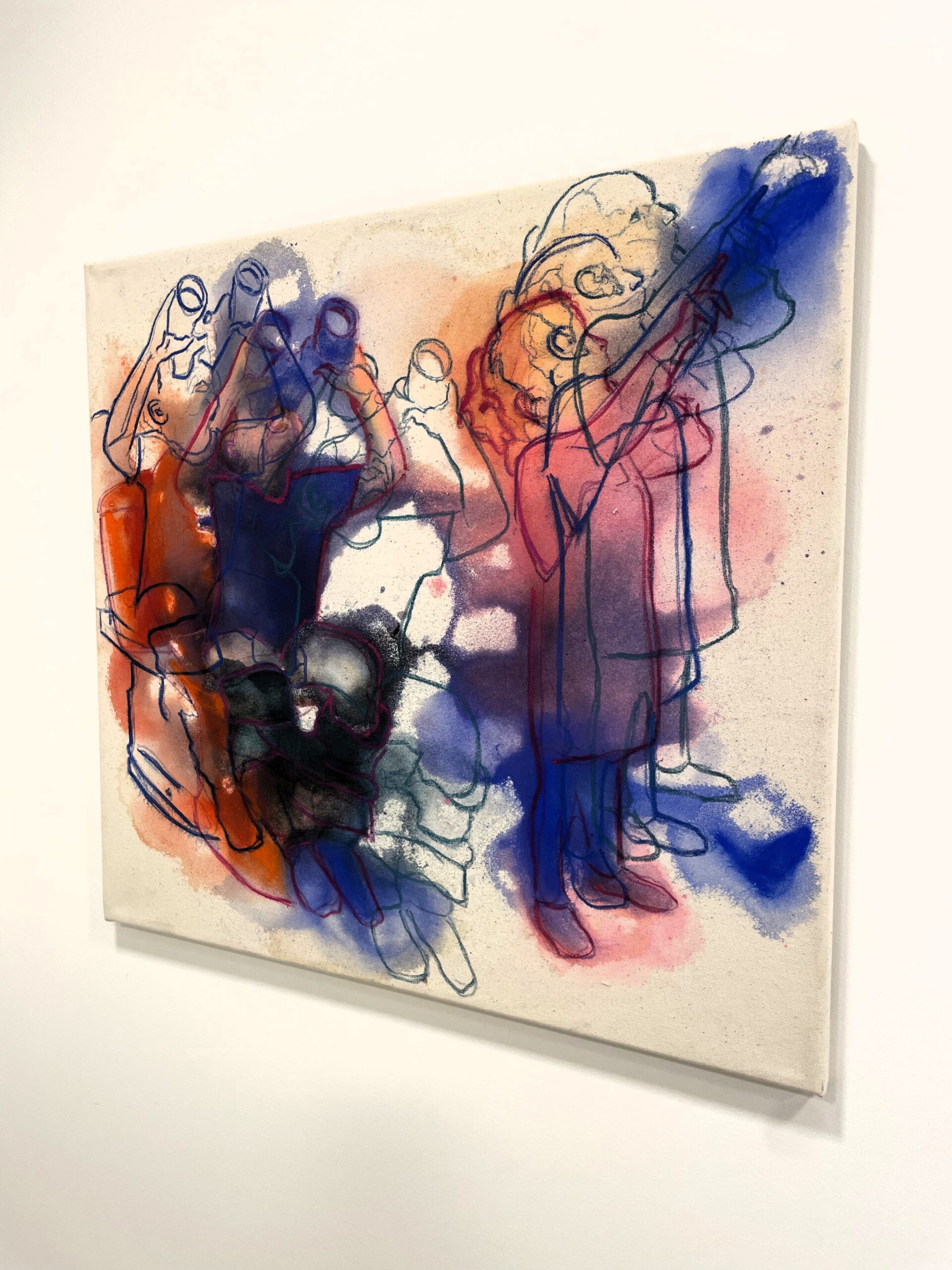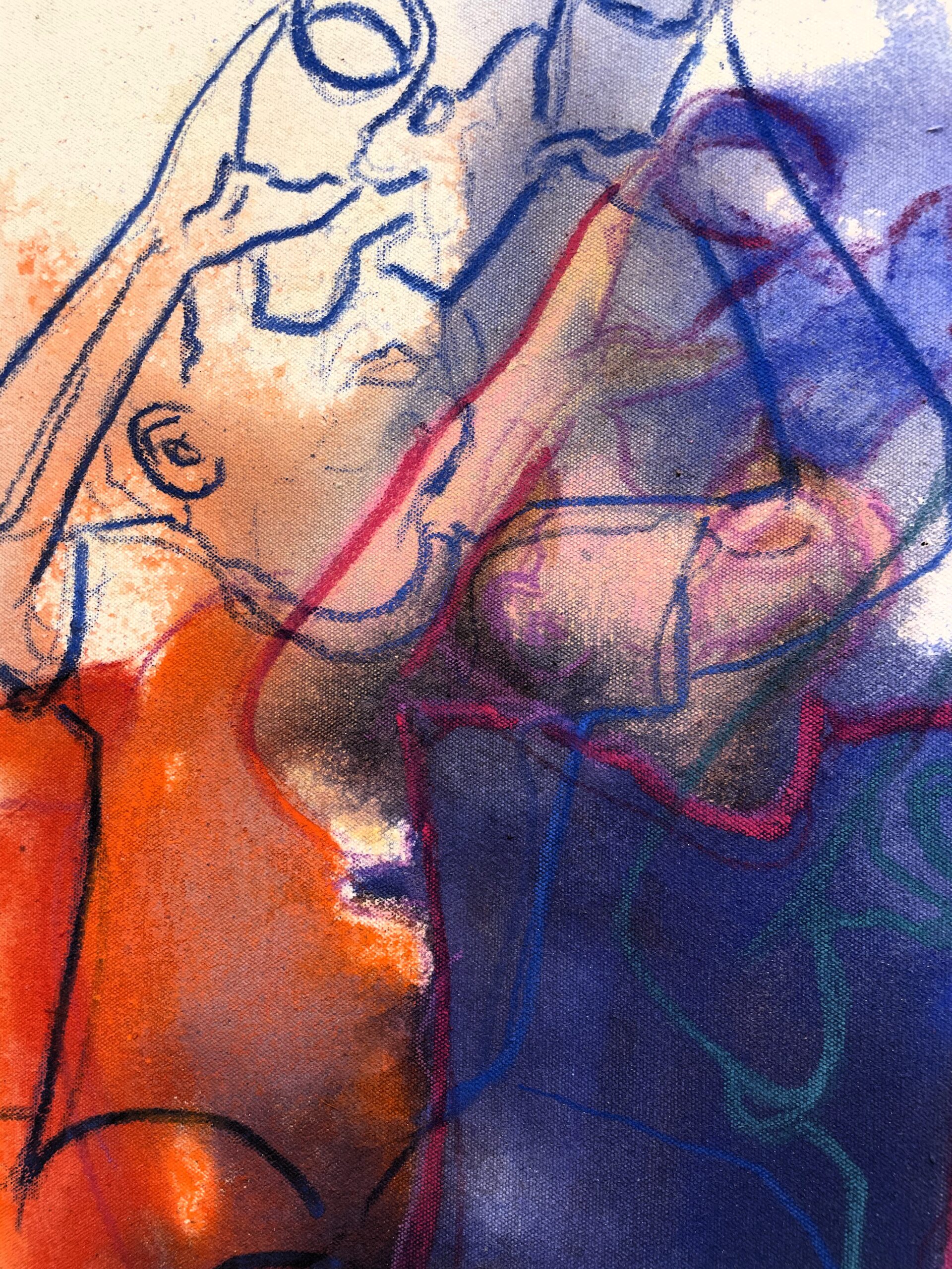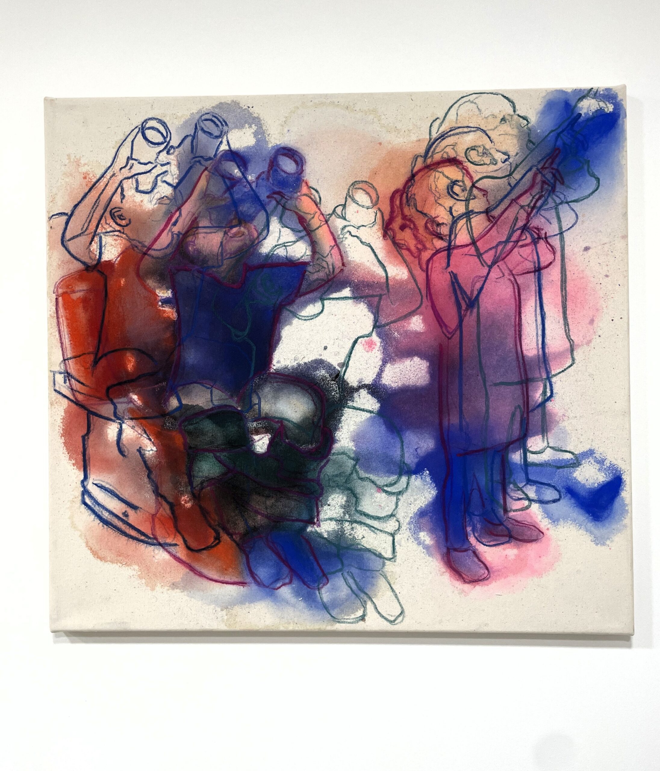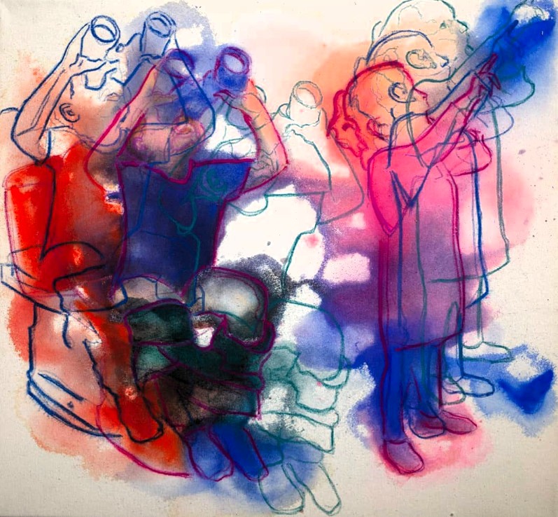 Postavy sú načrtnuté jemnými, priesvitnými líniami v odtieňoch červenej, modrej, fialovej a zelenej. Farby sa miestami prelínajú a dopĺňajú, čím vytvárajú dojem vzájomného pohybu a prepojenia. Každá farba nesie inú emóciu. Spolu vytvárajú dynamický rytmus, ktorý naznačuje, že deti neustále menia svoje polohy a gestá. Obraz zachytáva moment tesne pred pohybom, no zároveň akoby sa už pomaly rozplýval v čase.