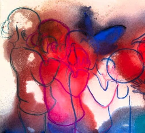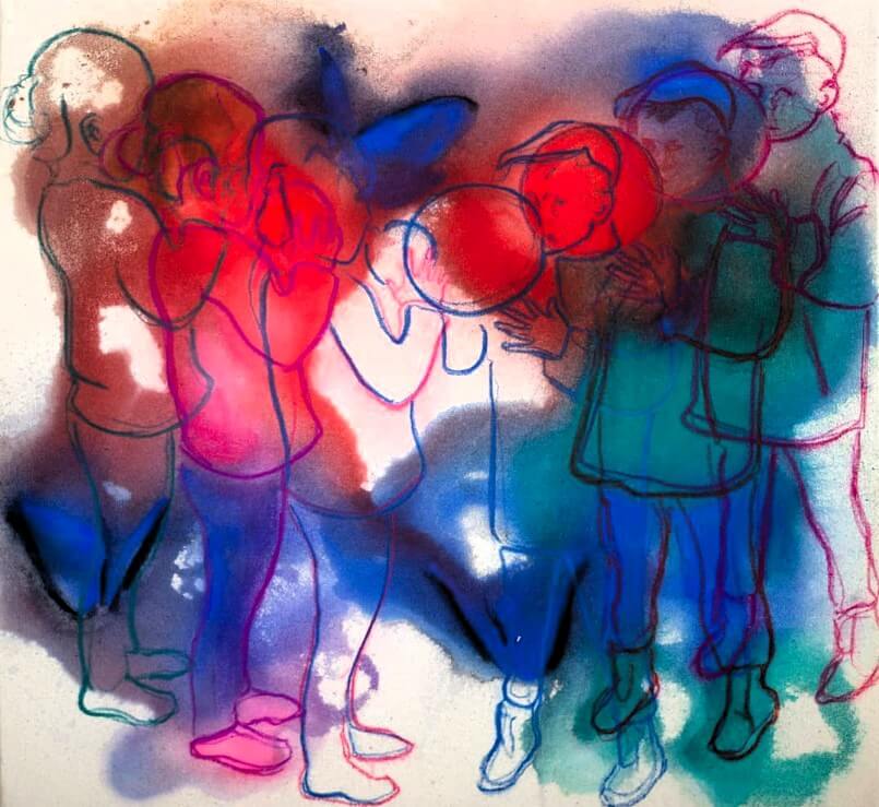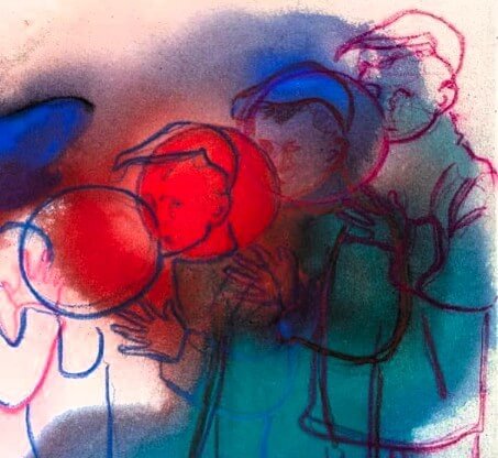 Trojica dievčat a trojica chlapcov sleduje loptu uprostred kompozície. Okolo nej poletujú tri motýle, ktoré spájajú celý výjav do jemného, takmer rozprávkového pohybu. Postavy autor kreslí jemnými, priesvitnými líniami v odtieňoch červenej, modrej, fialovej a zelenej. Farby sa navzájom prelínajú a dopĺňajú, takže vytvárajú dojem prepojenia a tichej energie.
