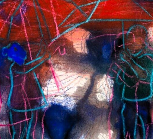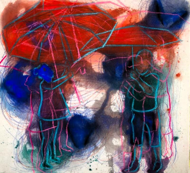 Tento obraz zobrazuje deti pod farebnými dáždnikmi, ktoré ich chránia pred dažďom. Scéna symbolizuje starostlivosť, spolupatričnosť a vzájomnú ochranu. Deti pôsobia radostne a hravo, čím obraz vyvoláva pocit bezpečia a tepla. Žiarivé farby a živá kompozícia podnecujú predstavivosť a radosť zo spoločného prežívania každodenných chvíľ.
