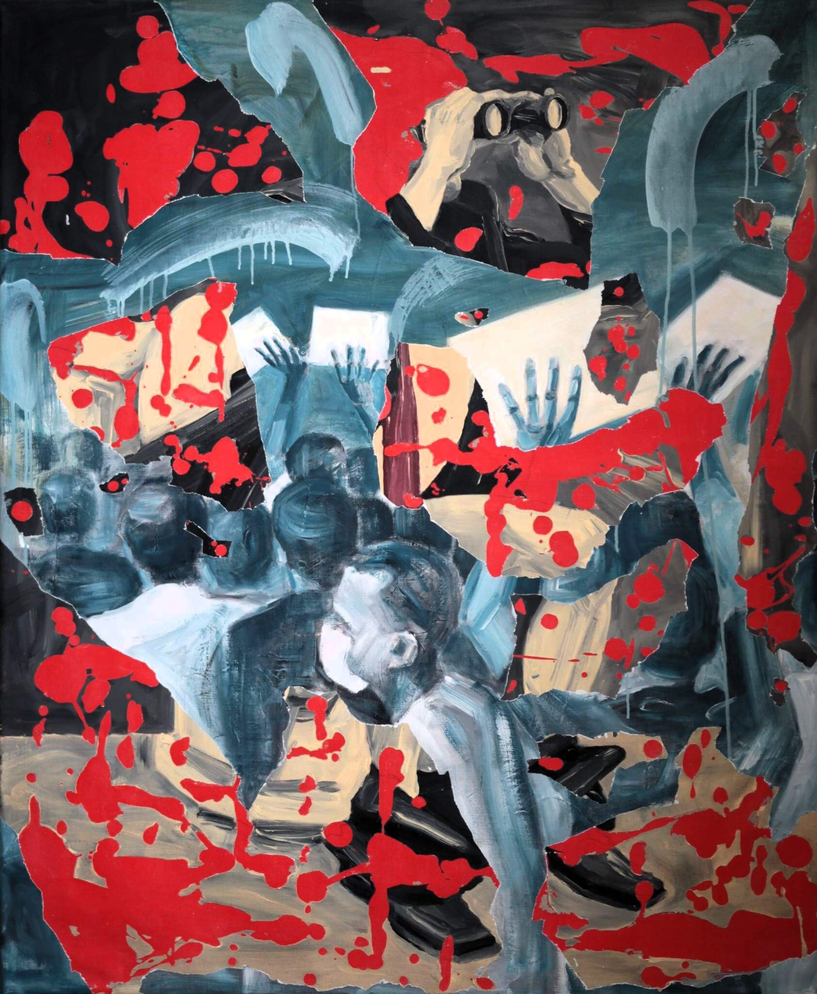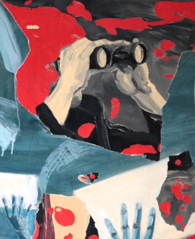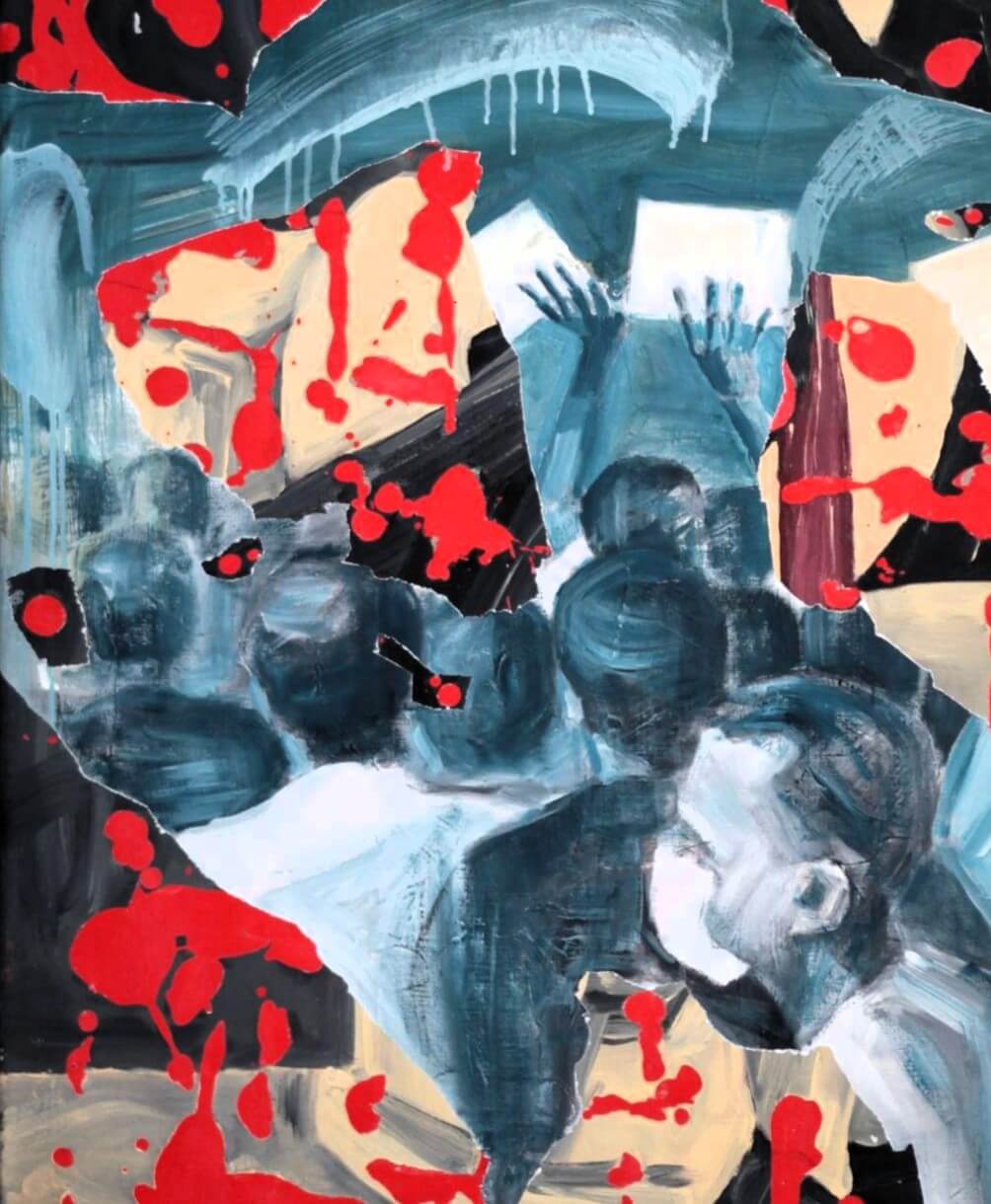 Dielo je založené na kontraste tvarov a farieb. Studené tóny sa prelínajú s teplými a tmavé plochy stoja oproti svetlým. Textúry s rôznou hustotou vytvárajú pocit vrstvenia a stopy štetca dodávajú obrazu energiu a pohyb. Miesta s hustou farbou sa stretávajú s prázdnymi plochami, čo núti oko diváka neustále hľadať rovnováhu. Obraz nepôsobí pokojne, naopak vyvoláva dojem konfliktu a nesúhlasu.