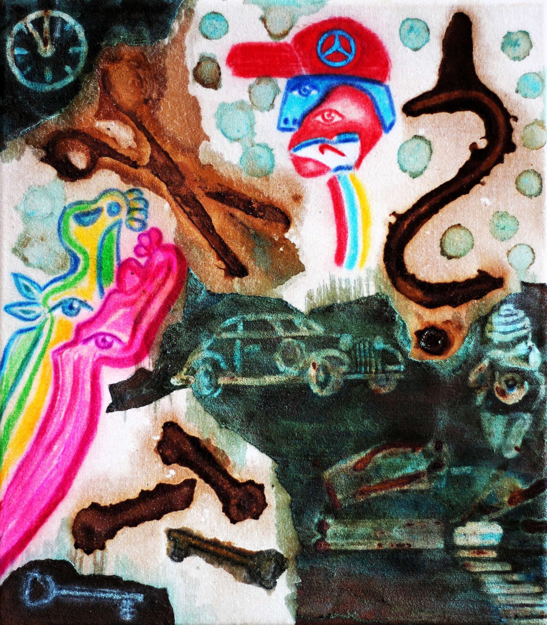 Farebnosť je intenzívna a hravá, s dôrazom na fluorescenčné tóny ružovej, žltej a modrej. Ich energia ostro kontrastuje s tmavšími hnedými a zelenými plochami, ktoré pôsobia ako podklad. Symboly hodiniek, áut či kostí rozširujú významovú rovinu a otvárajú otázky o plynutí času, konzume či pomíjivosti.