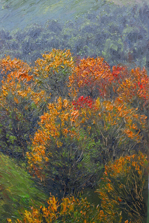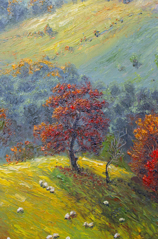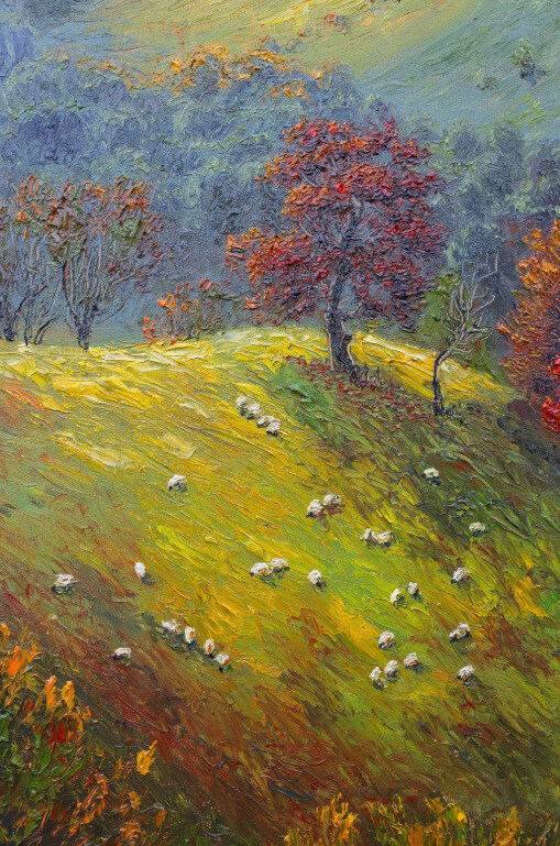 Obraz zachytáva rozľahlú karpatskú krajinu, kde sa striedajú lesy a otvorené horské lúky. Na hrebeni sa pasú ovce, ktoré vnášajú do scény jemný pohyb a pripomínajú tradičný horský spôsob života. Teplé farby presiaknu celú kompozíciu, evokujú pokojné popoludňajšie svetlo a vytvárajú meditativnú, harmonickú atmosféru, ktorá zvýrazňuje tichú krásu a pokoj horskej prírody.