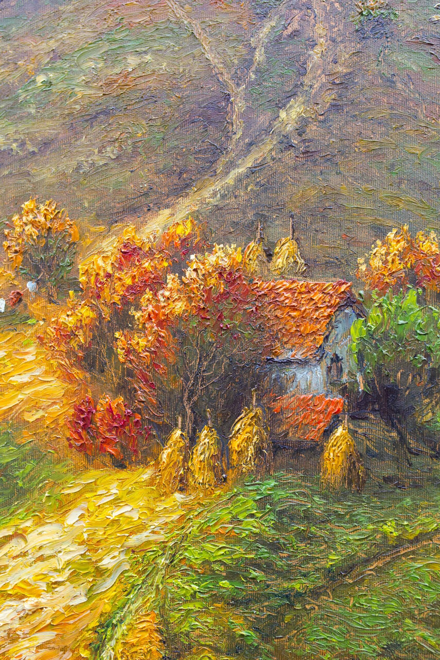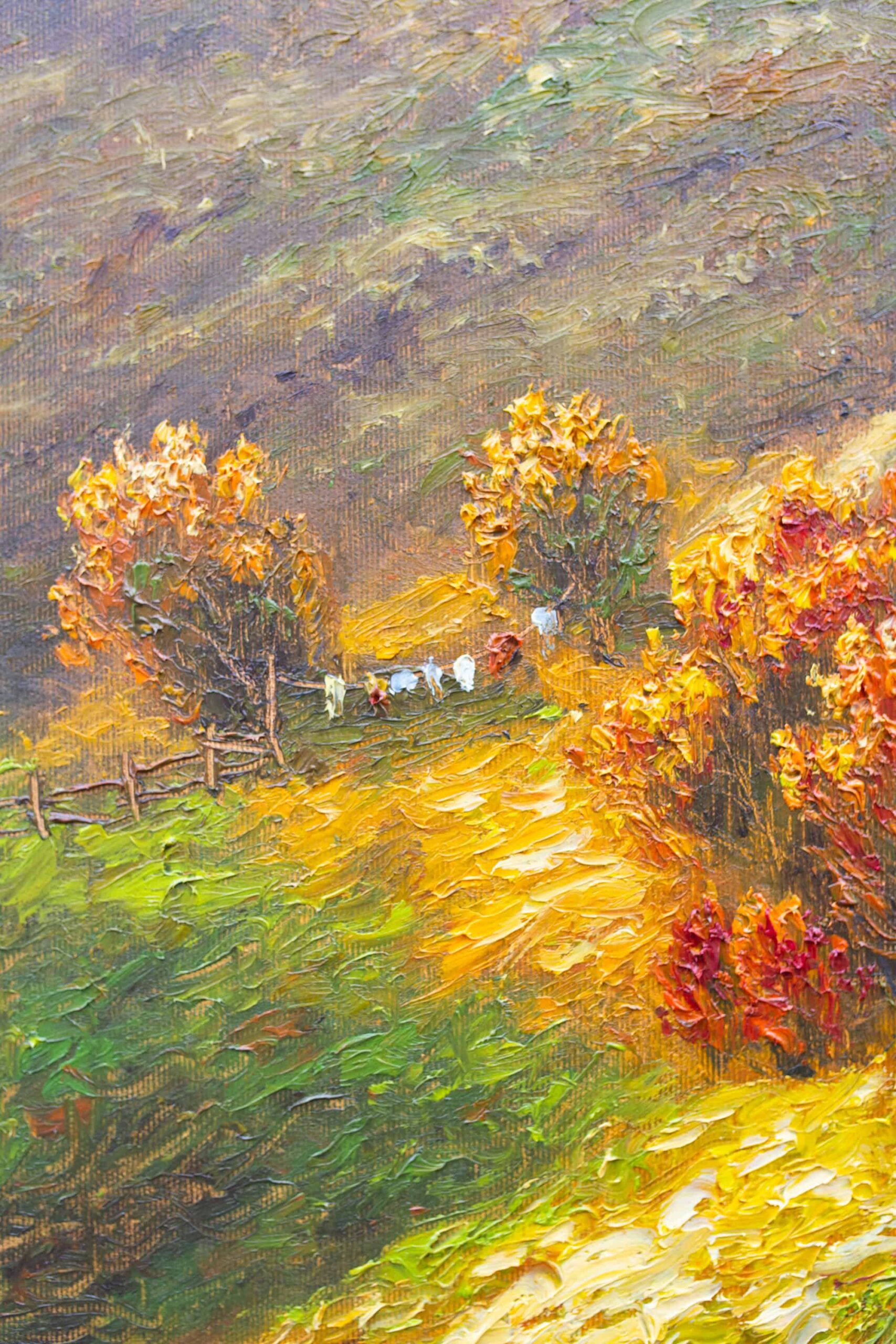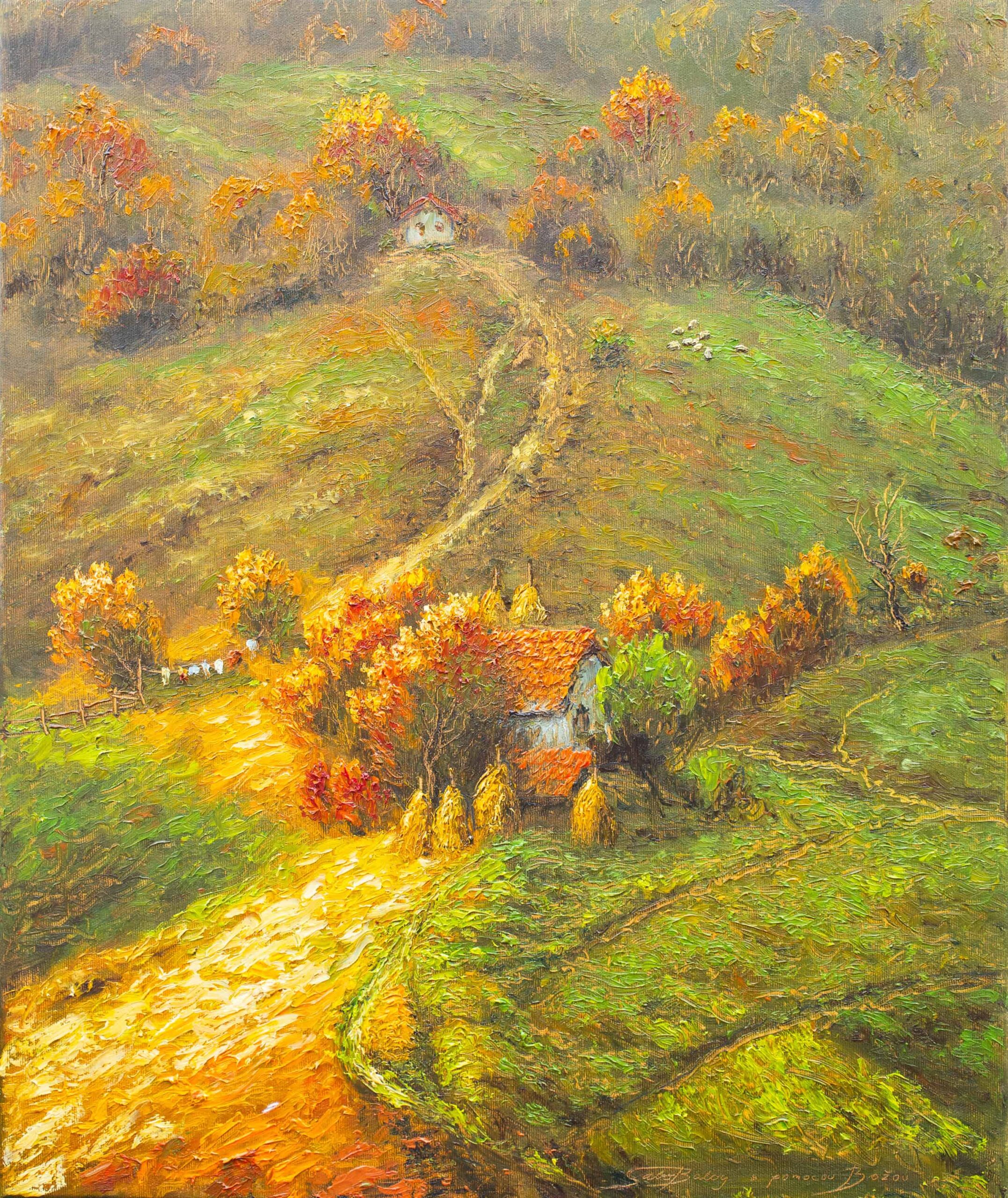 Obraz zobrazuje dve stavenia, dva domovy rodín žijúcich v srdci Karpát. Autor zachytáva jesenné obdobie, keď sa horská krajina mení na bohatú paletu farieb. Zlaté, medené a červené tóny sa miešajú s tmavozelenými lesmi. Spolu vytvárajú harmonickú a pokojne pôsobiacu scenériu. Dielo vyjadruje blízkosť človeka k prírode a krásu života v jej prirodzenom rytme. Karpaty tu ukazujú svoju jedinečnú tvár, ktorá sa mení s každým ročným obdobím.