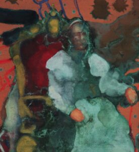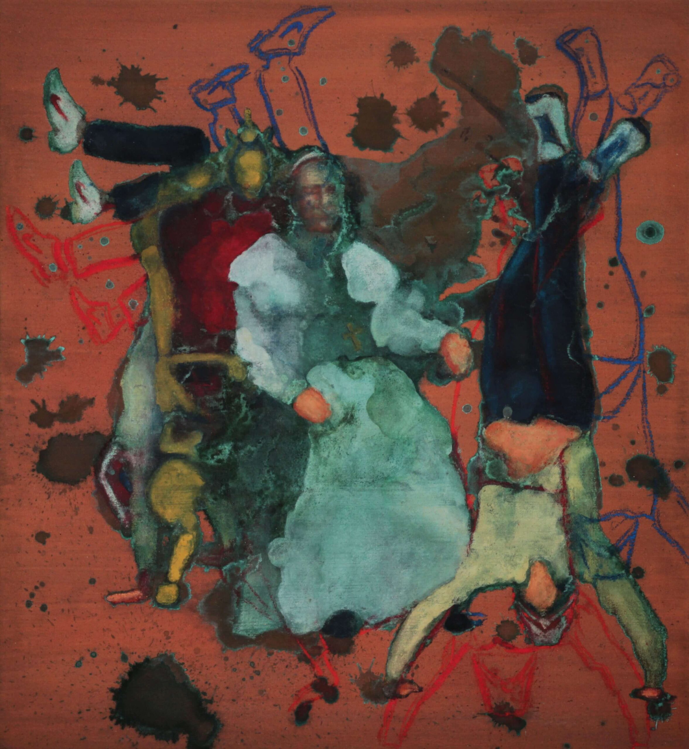Dielo zobrazuje pápeža sediaceho na tróne. Okolo neho stoja postavy na rukách. Pápež pôsobí ako stabilný a trvalý prvok kompozície. Postavy okolo neho vytvárajú dojem rovnováhy a krehkosti. Kontrast medzi nimi a jeho autoritou pridáva obrazu dynamiku a napätie.