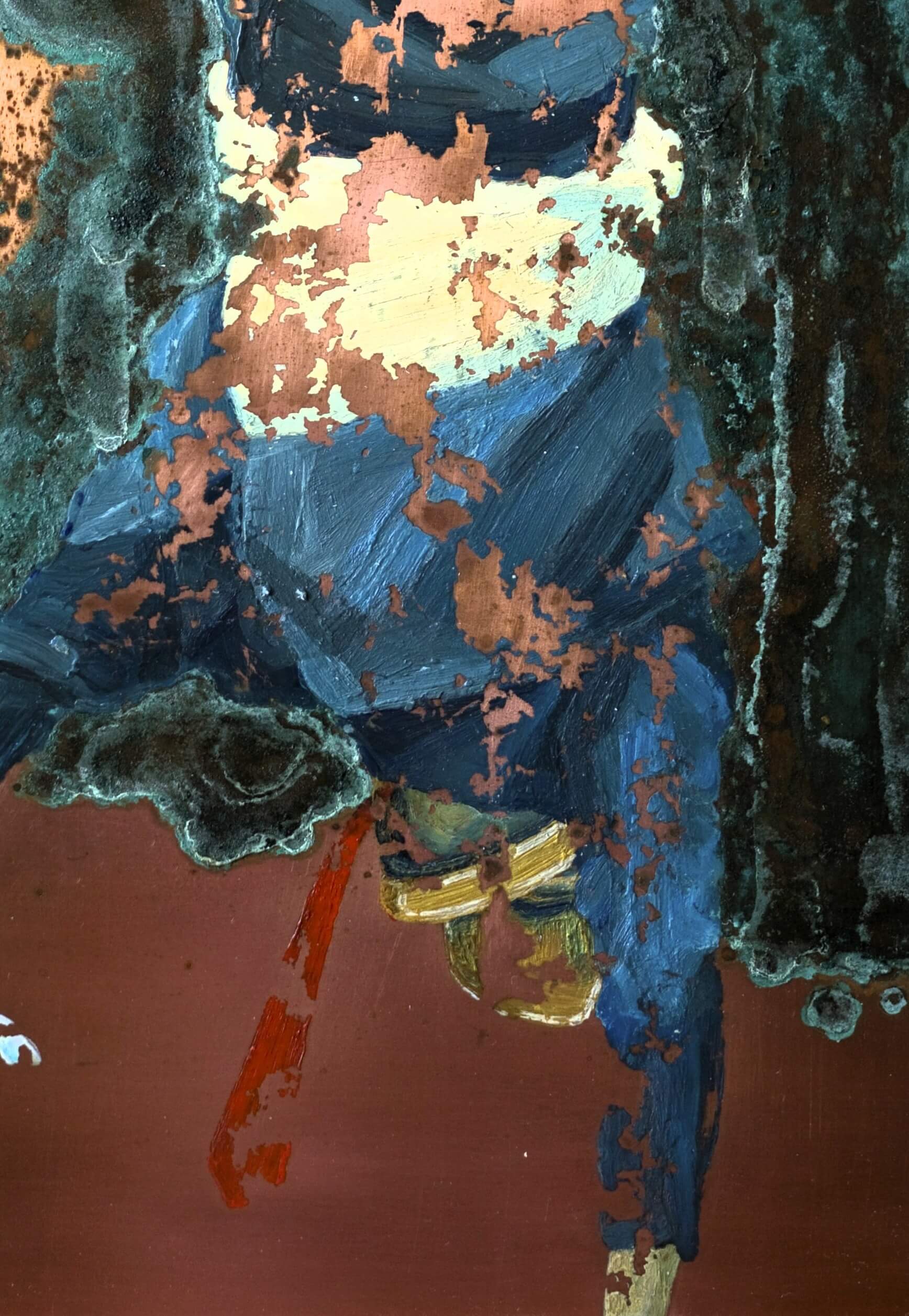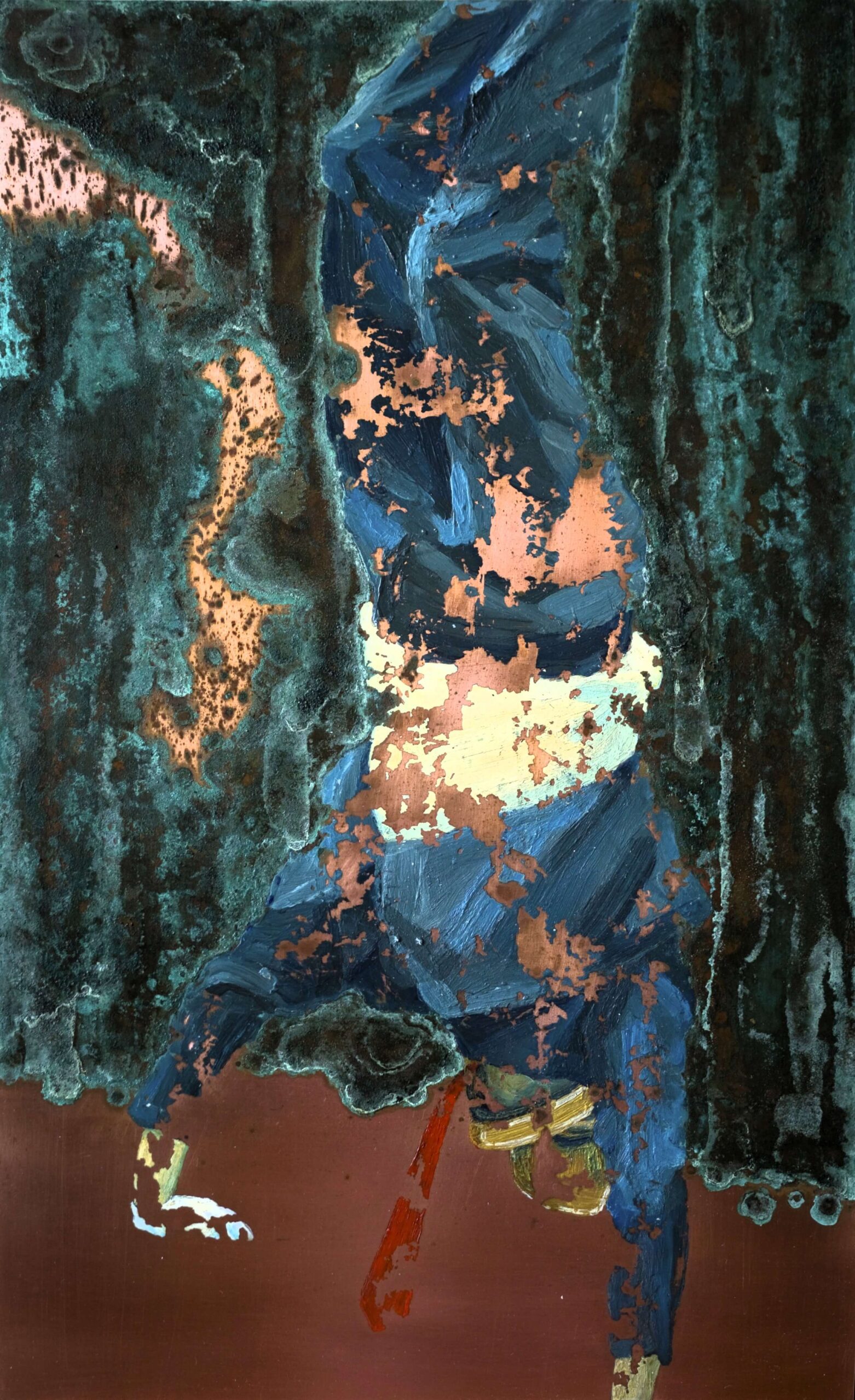 Dielo predstavuje experimentálne spojenie figuratívneho a abstraktného vyjadrenia s bohatou vrstvenou textúrou a dynamickou farebnou paletou. Postava stojaca uprostred kompozície vyžaruje stabilitu a silu, pričom kontrasty svetla a tieňa zvýrazňujú priestorovú hĺbku a napätie v obraze. Hmatateľné textúry a gestické ťahy vytvárajú pulzujúci efekt a prinášajú divákovi možnosť objavovať nové detaily pri každom pohľade.