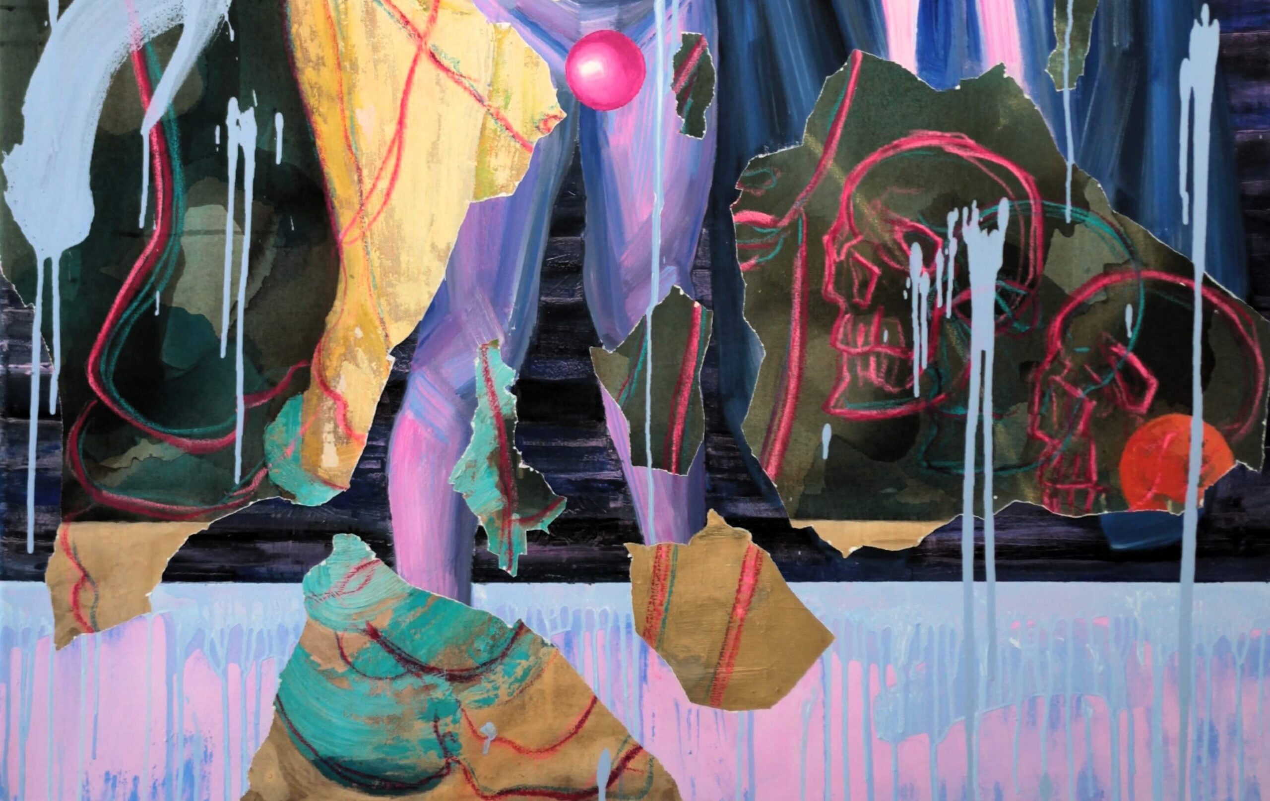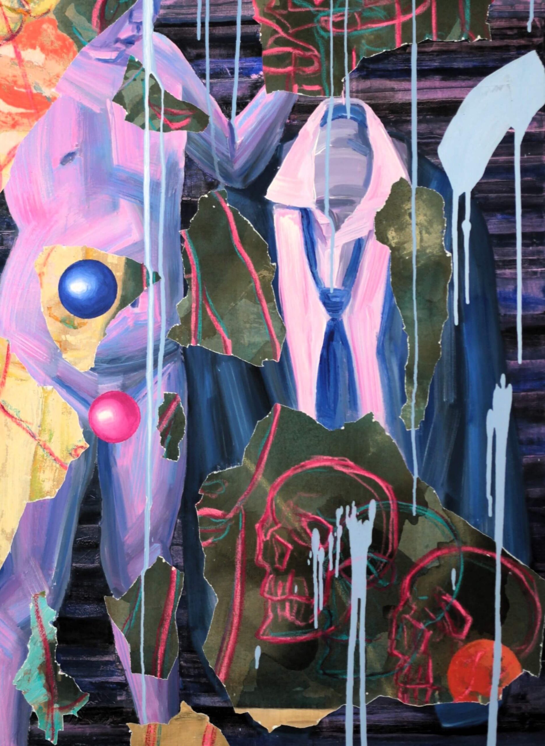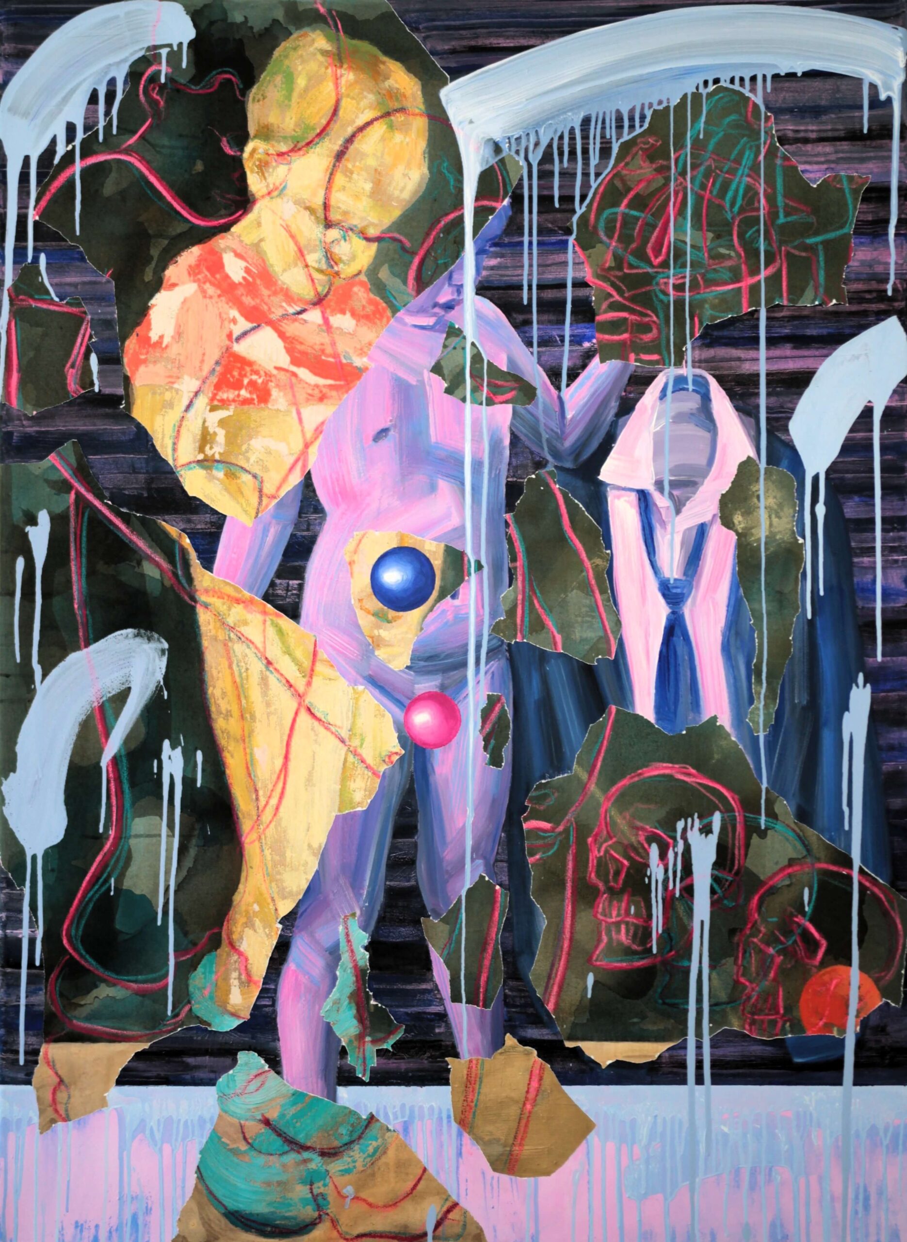 Farebná paleta spája intenzívne tóny s tlmenými odtieňmi. Studené fialové a modré línie sa prelínajú s teplými akcentmi žltej, ružovej a červenej. Kvapky a stekajúce plochy pôsobia ako prúd myšlienok, ktoré neustále pretekajú z vnútra von. Symboly lebiek a geometrických tvarov vytvárajú napätie a vyvolávajú nové otázky o zmysle zobrazenej scény.